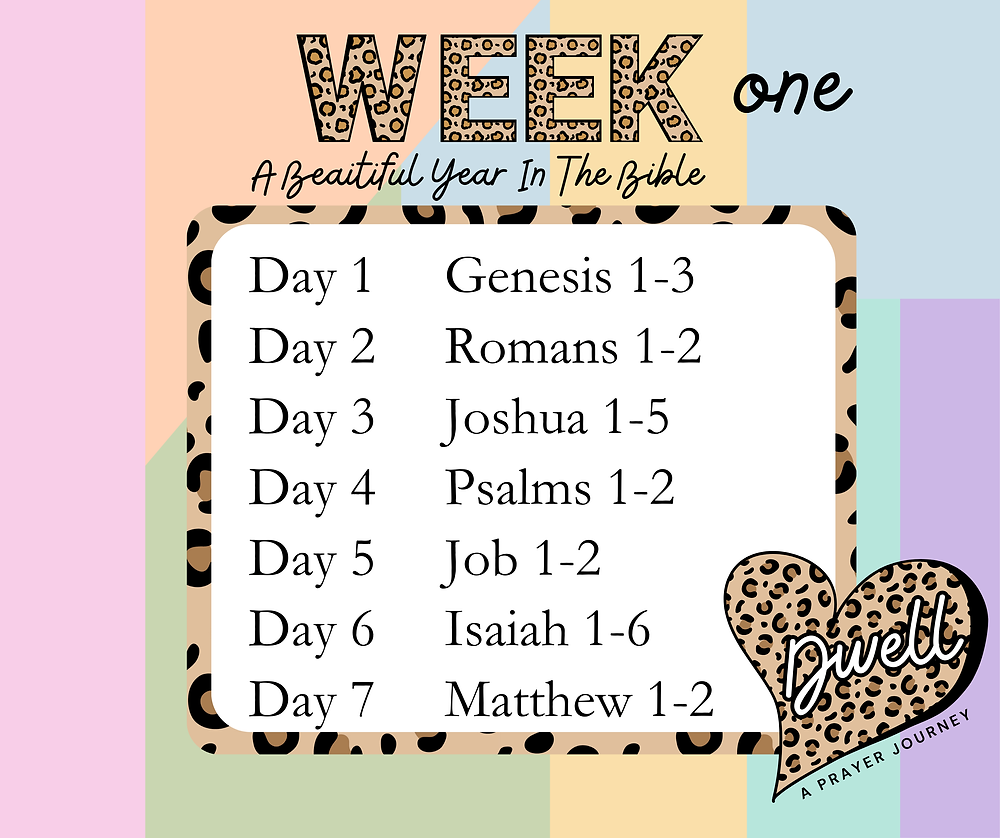 Join a group of sisters in Christ as we dive in to read an study the WHOLE Bible in a year! Be a part of group discussions and growth by joining the Dwell Study Group on Facebook. Or follow along on this blog for encouragement, reflective questions, and recaps from our time with Jesus. We are better TOGETHER. Here is the first week's reading guide and a recap from days 1 and 3. ICYMI Here are the video recaps from Days 1 and 3, and Questions for Day 2 Day One Recap Ques